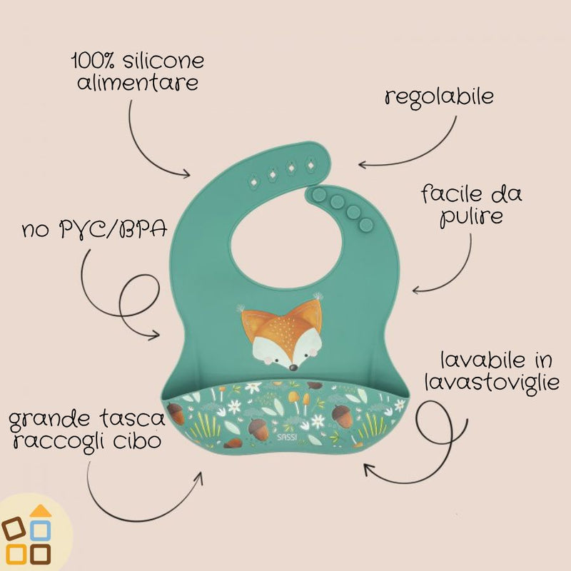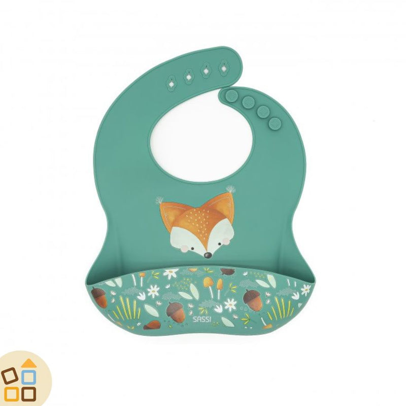 Cerchi un bavaglino per bambini? Questo è realizzato in sicuro silicone alimentare di alta qualità ed è adorabilmente decorato con la volpe Crunchy.