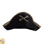 Argh!! Ogni pirata che si rispetti ha il suo cappello, soprattutto se sei il Capitano!Realizzato in morbido velluto nero, questo cappello è ricco di dettagli, come le rifiniture in oro metallizzato l'emblema scintillante tipico dei pirati, due ossa incrociate