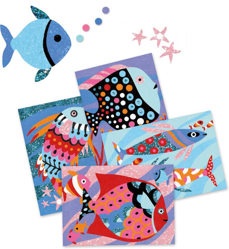 Un bellissimo kit creativo Djeco per divertirsi a colorare i pesci con colorate sabbie e scintillanti glitter!
