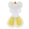 Con due strati di morbido tulle e fodera in un giallo brillante, la gonna è decorata con tante margherite glitter stampate e dei rampicanti ricchi di foglie verde brillante.Tulle trasparente e fiori gialli in glitter rifiniscono invece le romantiche ali!