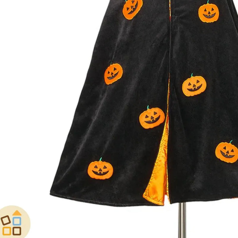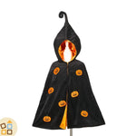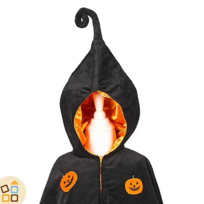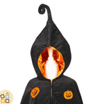 È morbidissimo e ha delle simpatiche zucche di Halloween che decorano il mantello nero e una fodera in raso arancione brillante.