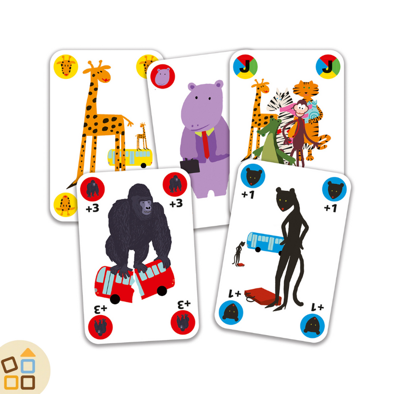 I giocatori devono liberarsi per primi delle proprie carte, abbinando animali o colori come nell’Otto Americano. Ma attenzione: le carte speciali possono cambiare il corso della partita con sorprese impreviste come salti di turno, inversioni e obbligo di pescare! E se appare il gorilla, serve rapidità e concentrazione!