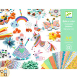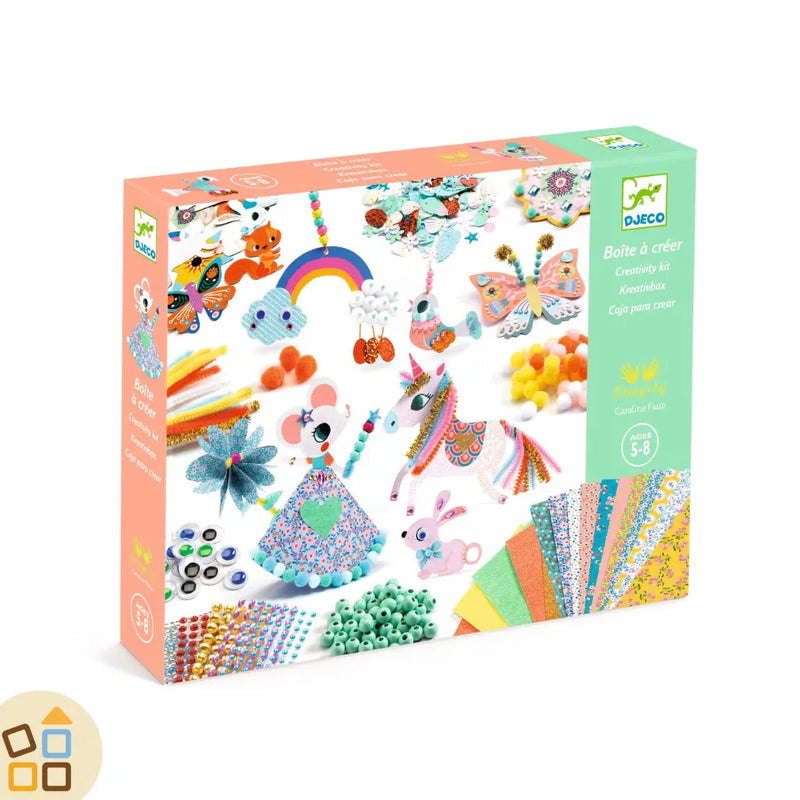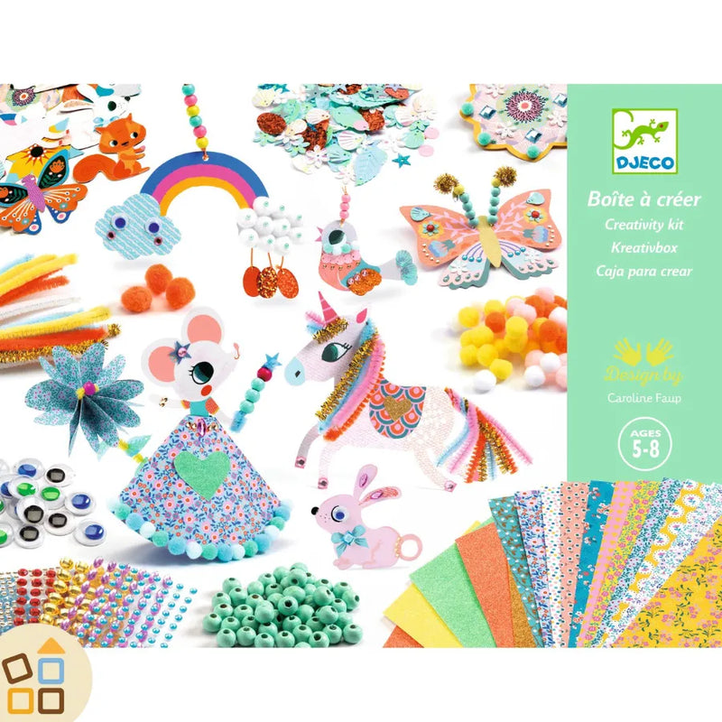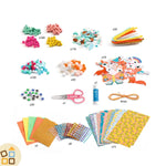 - Contenuto: una grande scatola di materiale su 2 piani con assortimento di perline, pompon, occhi mobili, adesivi, pietre preziose, fili di ciniglia... e cartoncini stampati + 15 schede di idee.