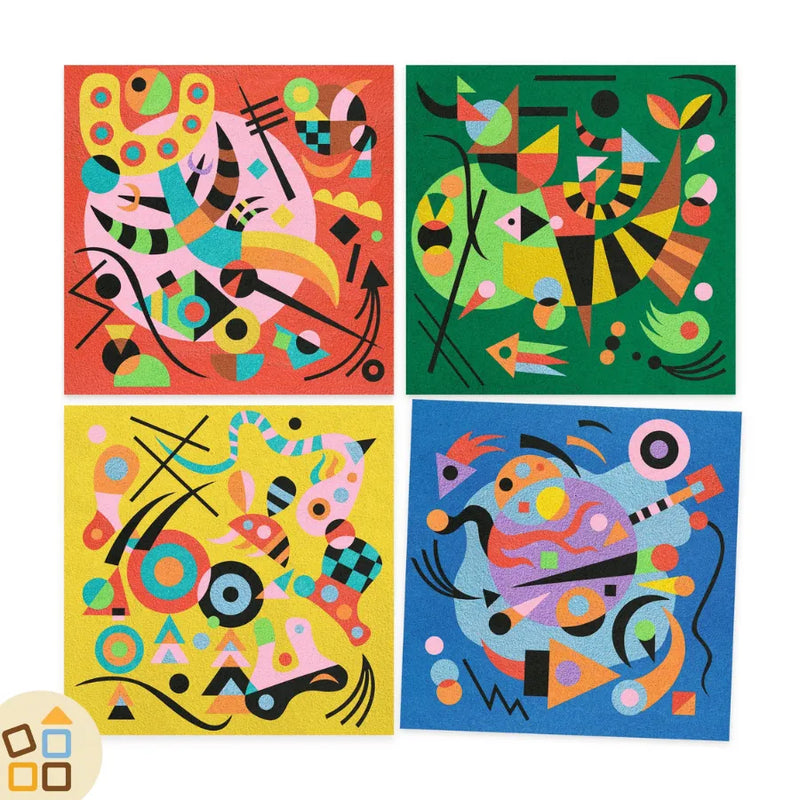 Dai vita all’arte astratta con il kit creativo Djeco ispirato al genio di Kandinsky! I bambini dai 7 anni potranno creare 4 quadri vibranti e colorati usando sabbie da applicare seguendo linee guida e numeri.