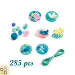 Questo kit creativo include già tutto l'occorrente: tante coloratissime perline di diverse forme e un lungo cordino