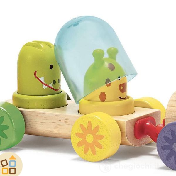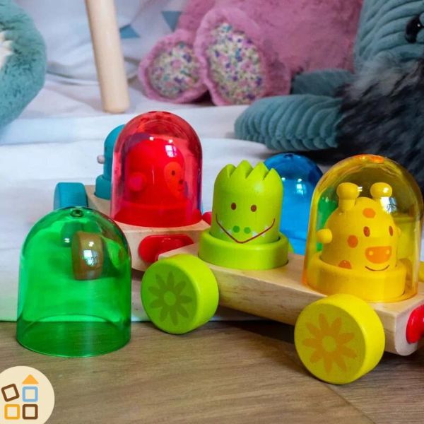 Questo gioco per bambini piccoli è un trenino di legno colorato che il bambino assembla secondo la sua immaginazione e con le 4 campane colorate traslucide gli faranno scoprire l'unione dei colori