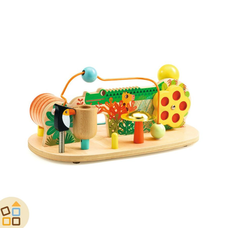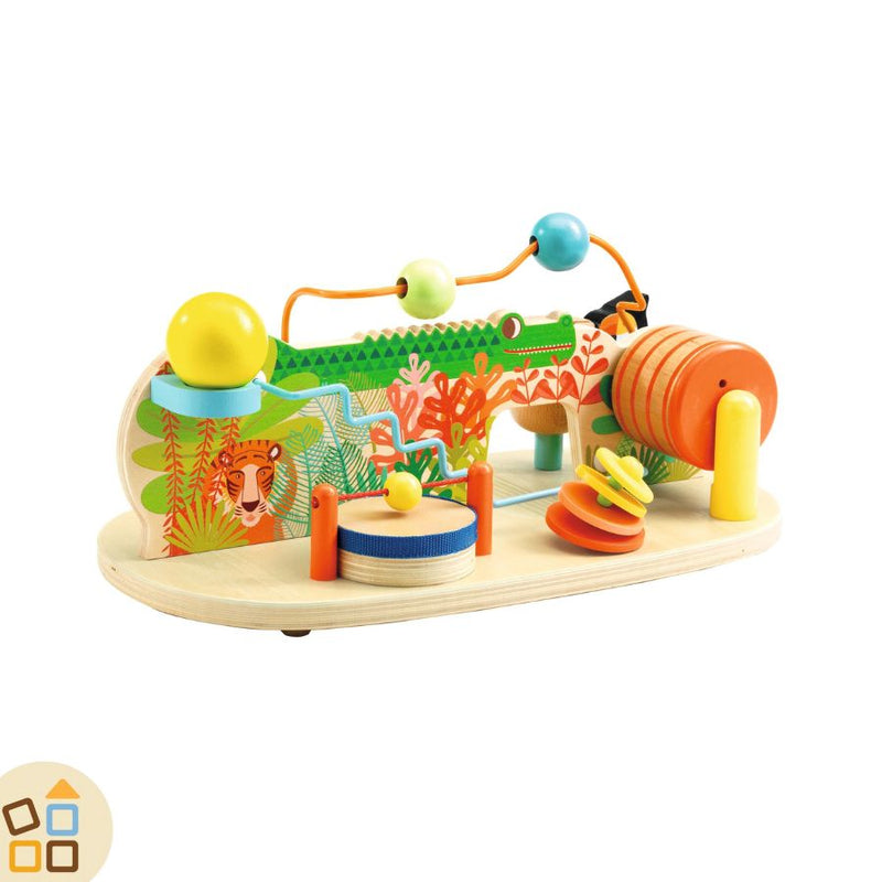 Ogni suono offre una nuova sorpresa: il tucano che salta sul cilindro in legno fa "toc toc", la ruota che gira suona "clac clac", la biglia che scivola sul dorso del coccodrillo fa "tac a tac a tac". E ancora: il cilindro metallico suona "dling dling", la biglia che cade sulla campana fa "cling", mentre la stessa biglia sull’elastico produce un suono di tamburello "pong". Infine, il toboggan metallico fa "ting ting ting" e i dischi che si scontrano aggiungono un simpatico "tic tic".Questa tavola sonora con tema coccodrillo è posata su piccoli piedi stabili e antiscivolo, garantendo sicurezza e ore di divertimento per i più piccoli. Perfetta per stimolare i sensi, la coordinazione e l’esplorazione sonora!