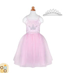 Questo classico vestito da principessa è adorabile nella sua semplicità ed è fornito di una sbrilluccicante tiara glitterata impreziosita da dettagli di gemme di perle!