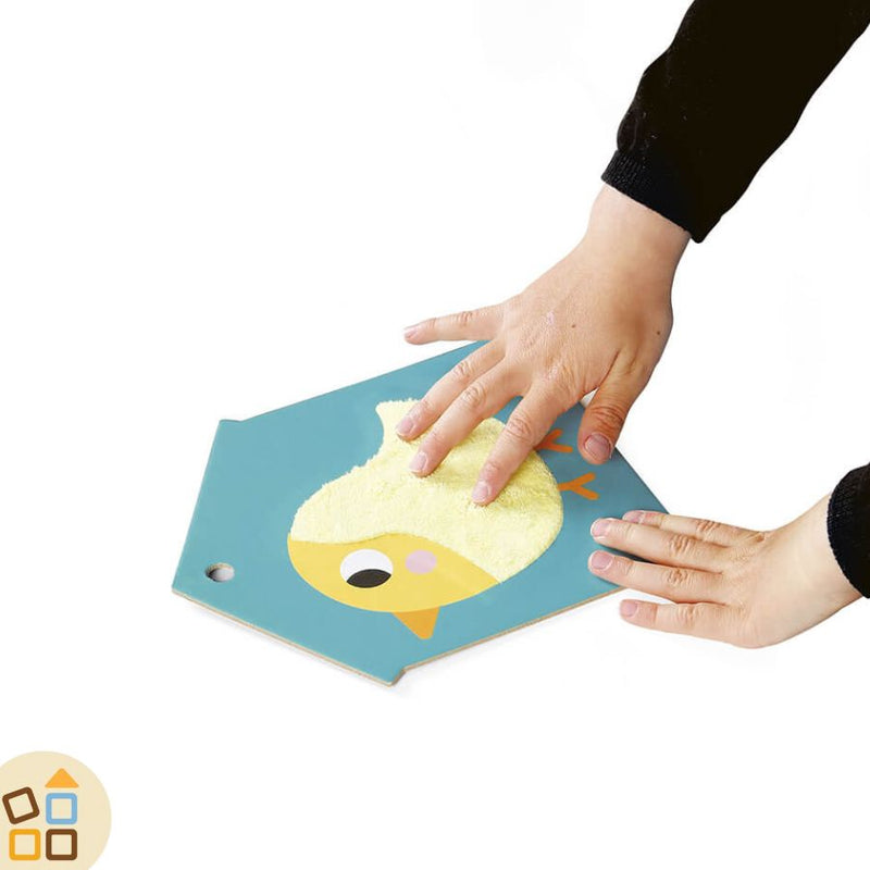Un gioco educativo e sensoriale che stimola lo sviluppo del tatto e della coordinazione nei bambini, realizzato in modo ecosostenibile con materiali certificati FSC® per il rispetto dell'ambiente.