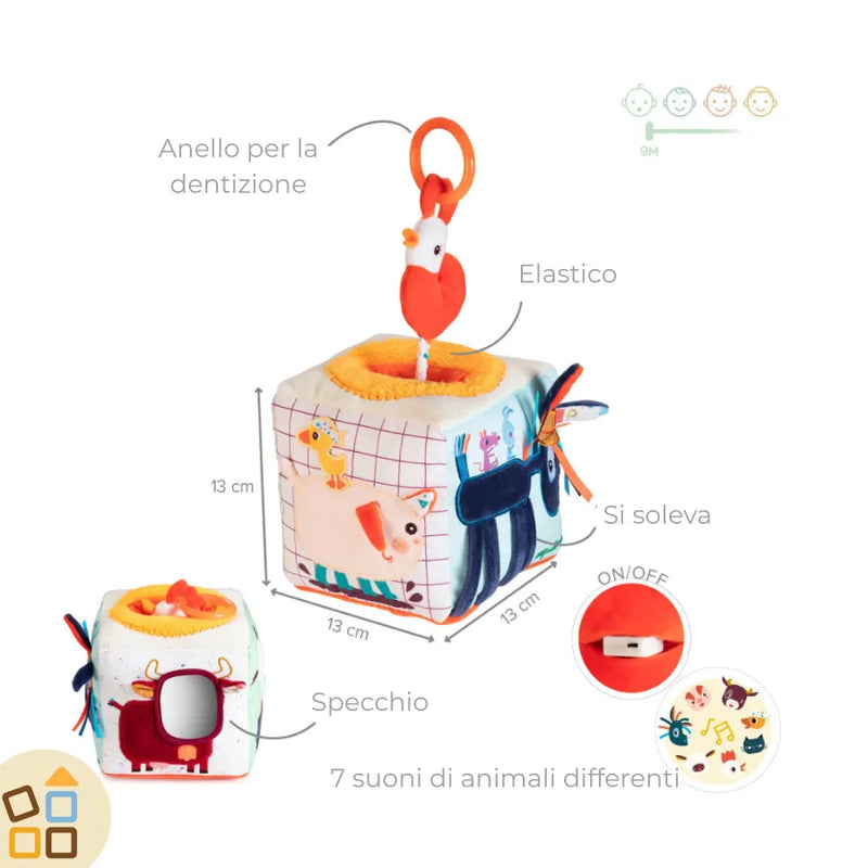 Un cubo morbido ricco di scoperte! Il Cubo sonoro Fattoria di Lilliputiens è un gioco multisensoriale pensato per accompagnare i più piccoli nelle prime esplorazioni.