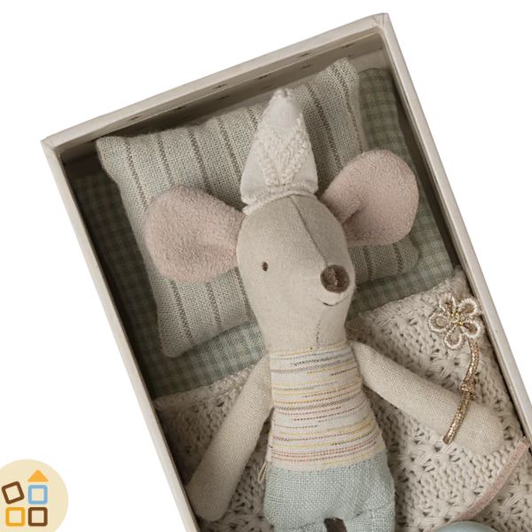 Il topino dei denti sparge polvere magica, raccoglie i denti e porta dolcetti per farvi fare sogni d'oro. Vestito magicamente, dorme in una morbida biancheria da letto (i tessuti possono variare)Il tutto è confezionato nella iconica e deliziosa scatola di fiammiferi Maileg