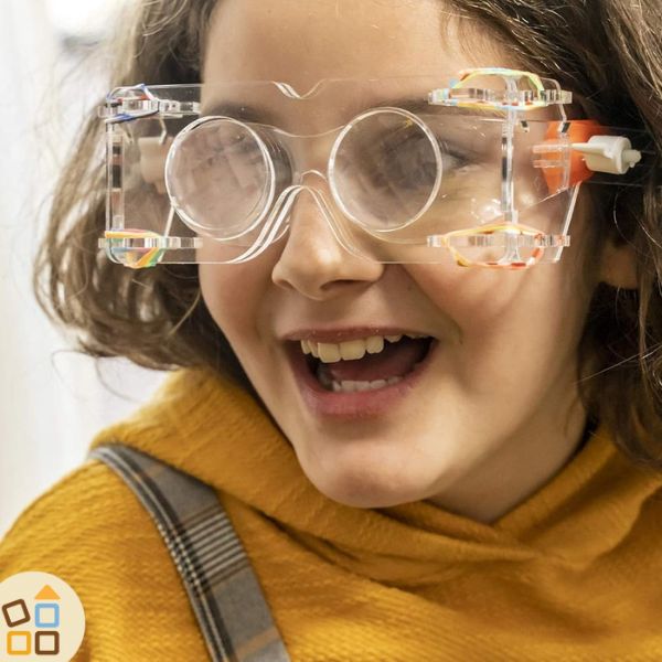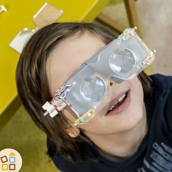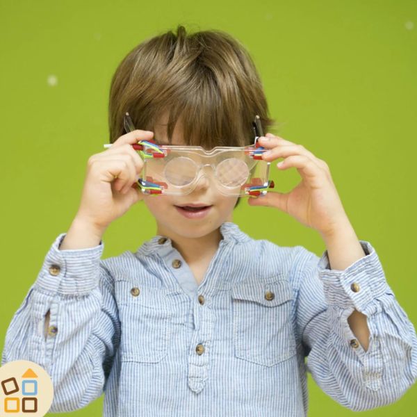 - Contenuto: Occhiali di sicurezza, lenti ottiche, specchi, viti, dadi, elastici, brochure con istruzioni passo passo illustrate e contenuti educativi su come funziona la visione, visione binoculare, visione degli animali