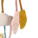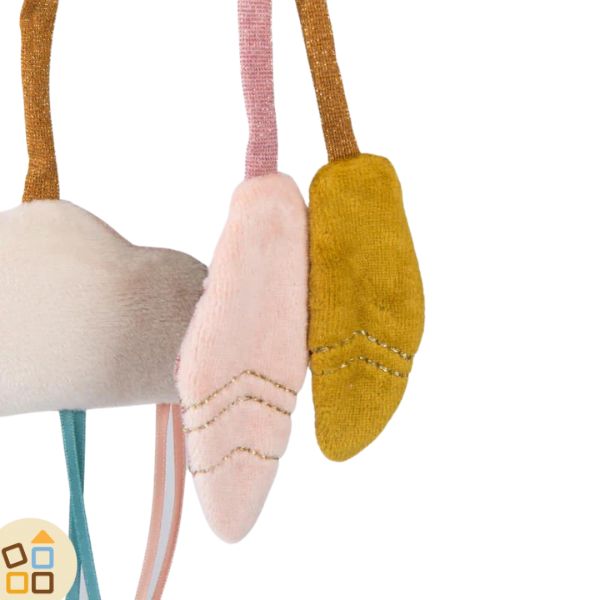 Ha una nuvola sonora da premere, ali che fanno suono di carta stropicciata, cordini da tirare e un sonaglio ad anello