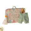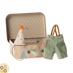 Il set comprende pantaloni con bretelle e un cappello, il tutto racchiuso in una piccola valigia di metallo facile da portare in viaggio