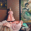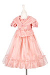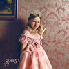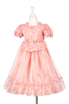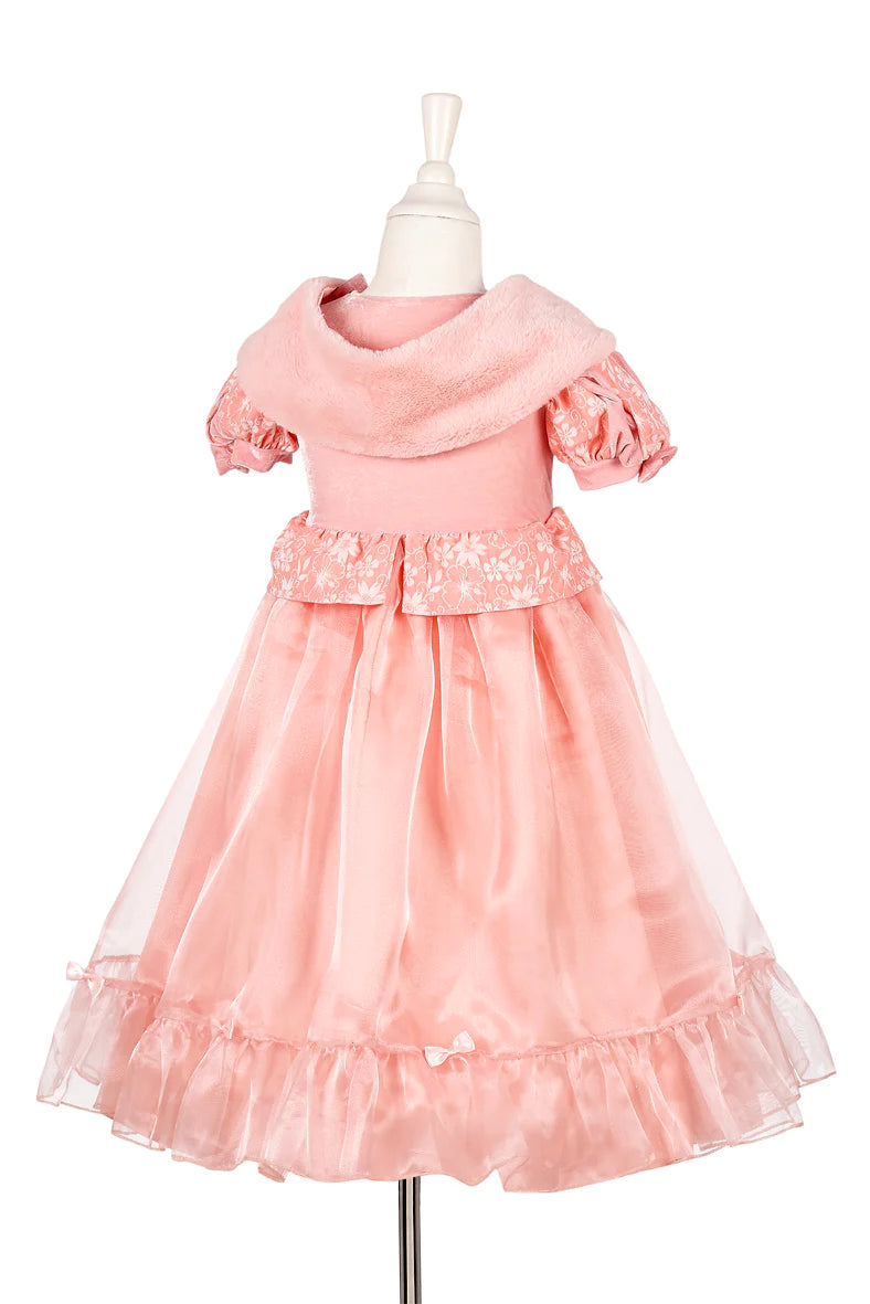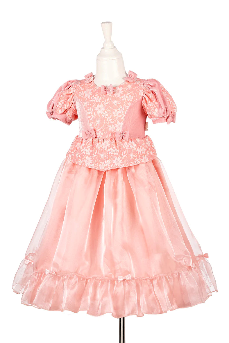 Il corpetto rosa pesca è decorato con delicati fiori bianchi e impreziosito da romantici fiocchi rosaIl pezzo forte è questo raffinato pellicciotto rosa coprispalle che dona un aspetto davvero regale a questo abito